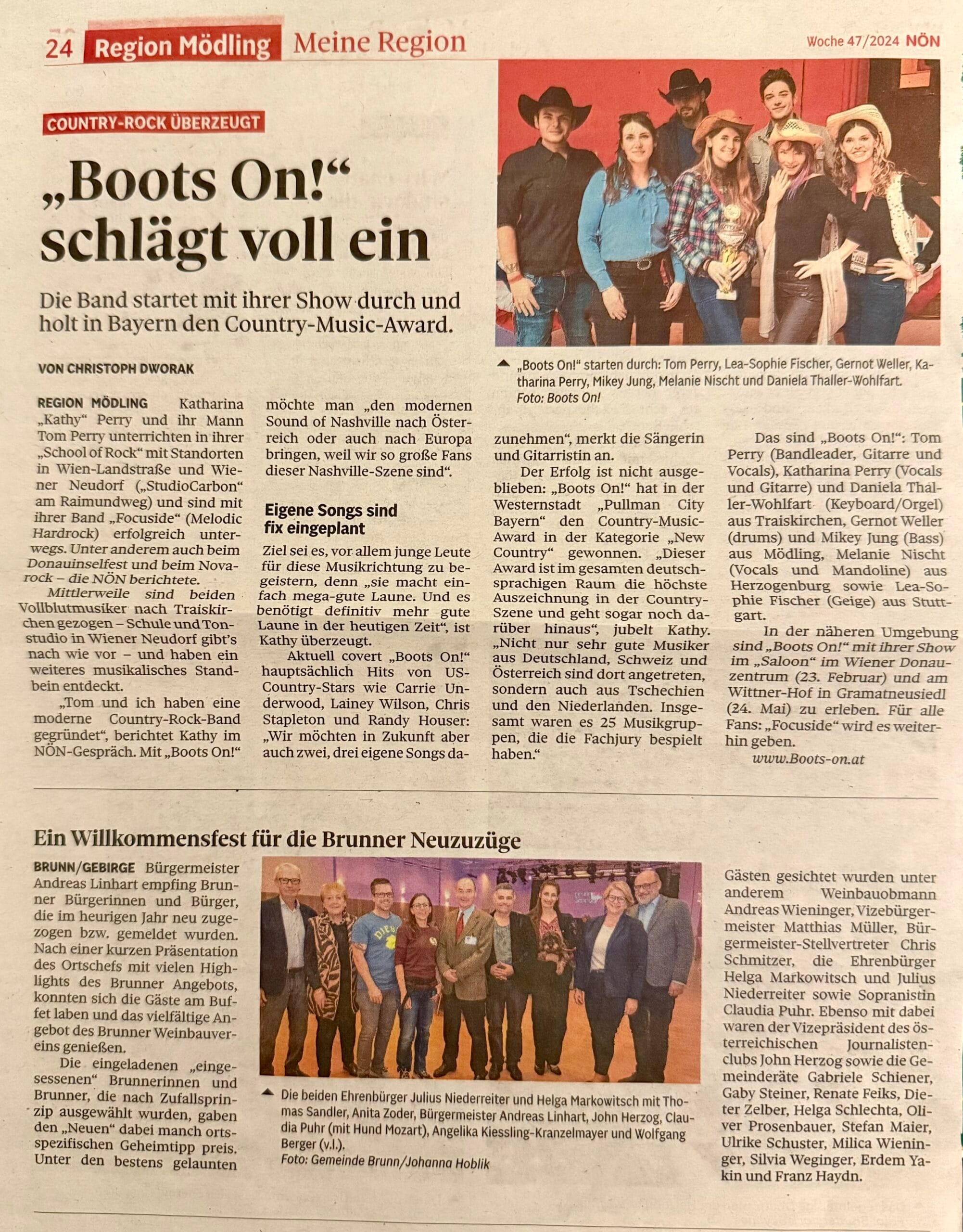 Mittlerweile sind beiden Vollblutmusiker nach Traiskirchen gezogen – Schule und Tonstudio in Wiener Neudorf gibt’s nach wie vor – und haben ein weiteres musikalisches Standbein entdeckt. „Tom und ich haben eine moderne Country-Rock-Band gegründet“, berichtet Kathy im NÖN-Gespräch. Mit „Boots On!“ möchte man „den modernen Sound of Nashville nach Österreich oder auch nach Europa bringen, weil wir so große Fans dieser Nashville-Szene sind“.