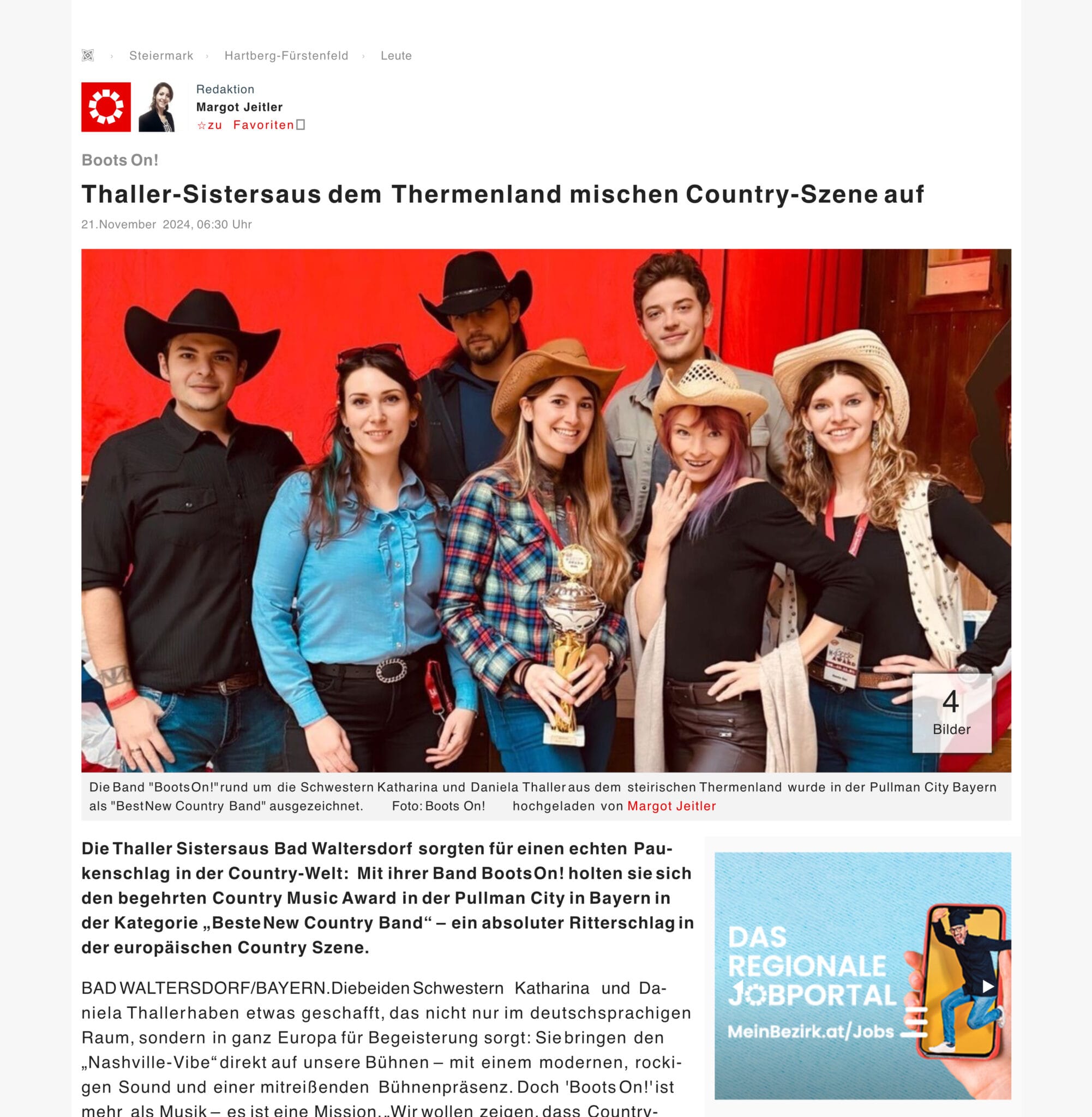 Die Thaller Sisters aus Bad Waltersdorf sorgten für einen echten Paukenschlag in der Country-Welt: Mit ihrer Band Boots On! holten sie sich den begehrten Country Music Award in der Pullman City in Bayern in der Kategorie „Beste New Country Band“ – ein absoluter Ritterschlag in der europäischen Country Szene.